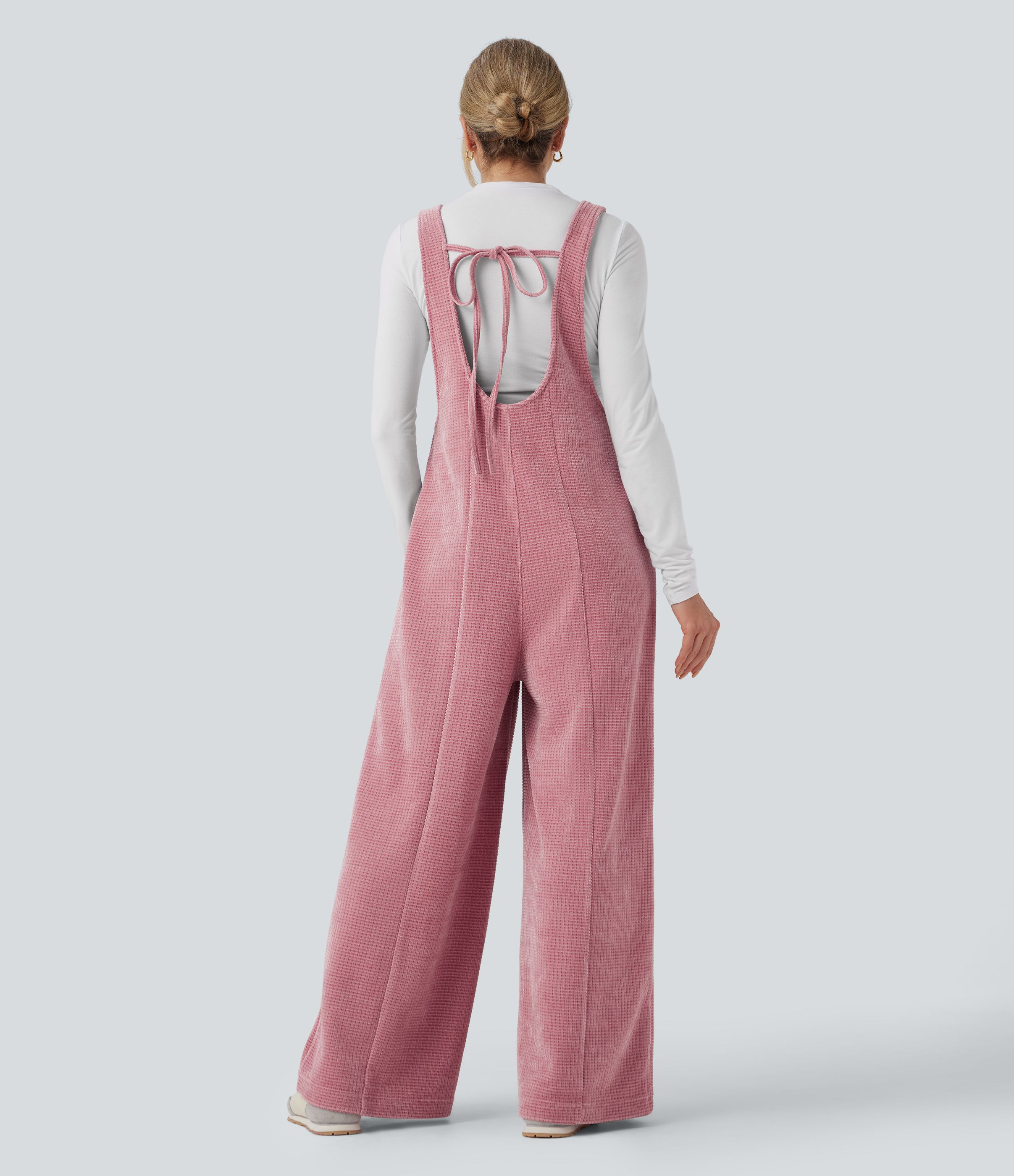 Tie Back Chenille Waffle Casual Overalls with Pockets