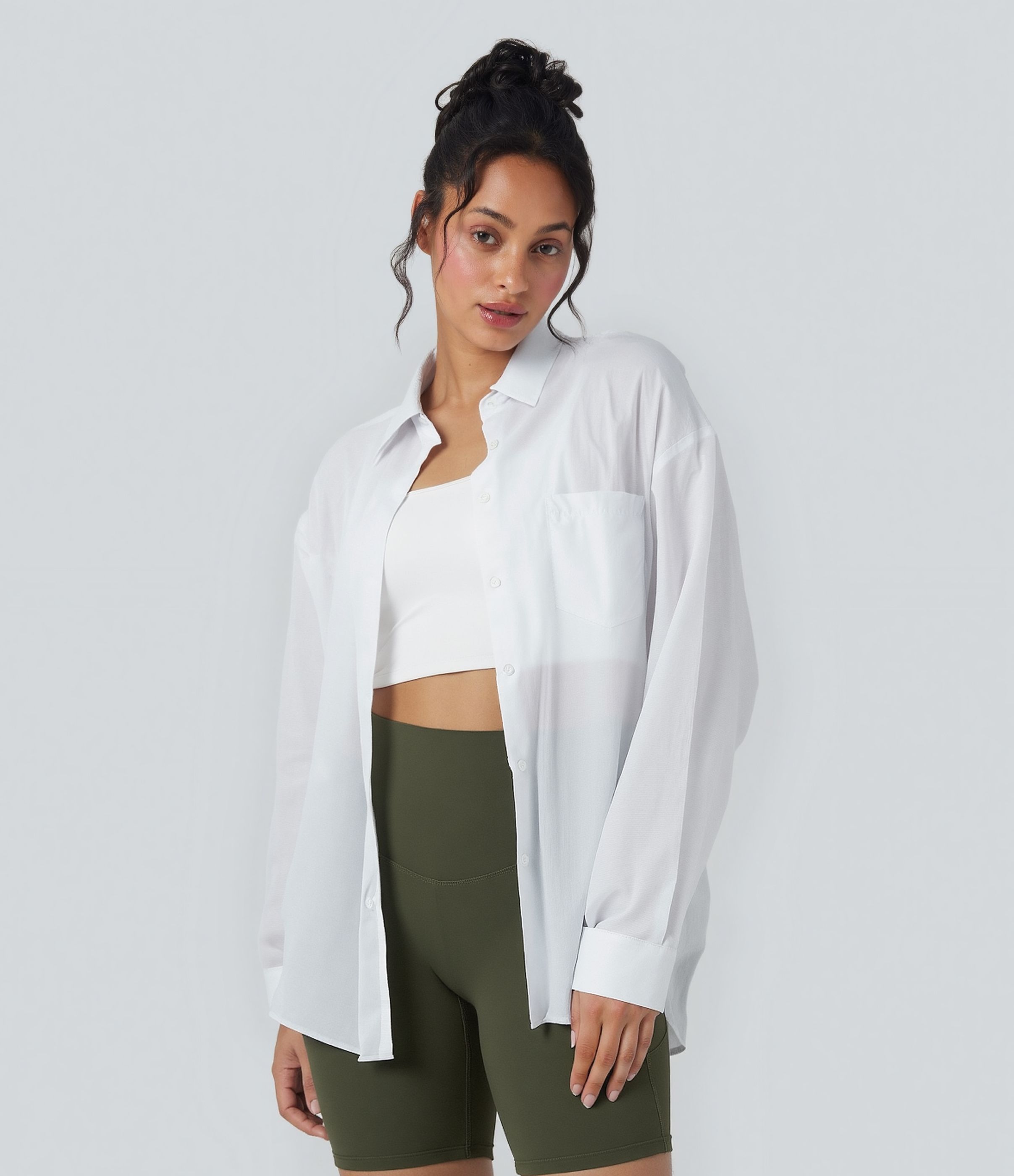 Collar Long Sleeve Curved Hem Hiking Shirt with Pocket-UPF40+