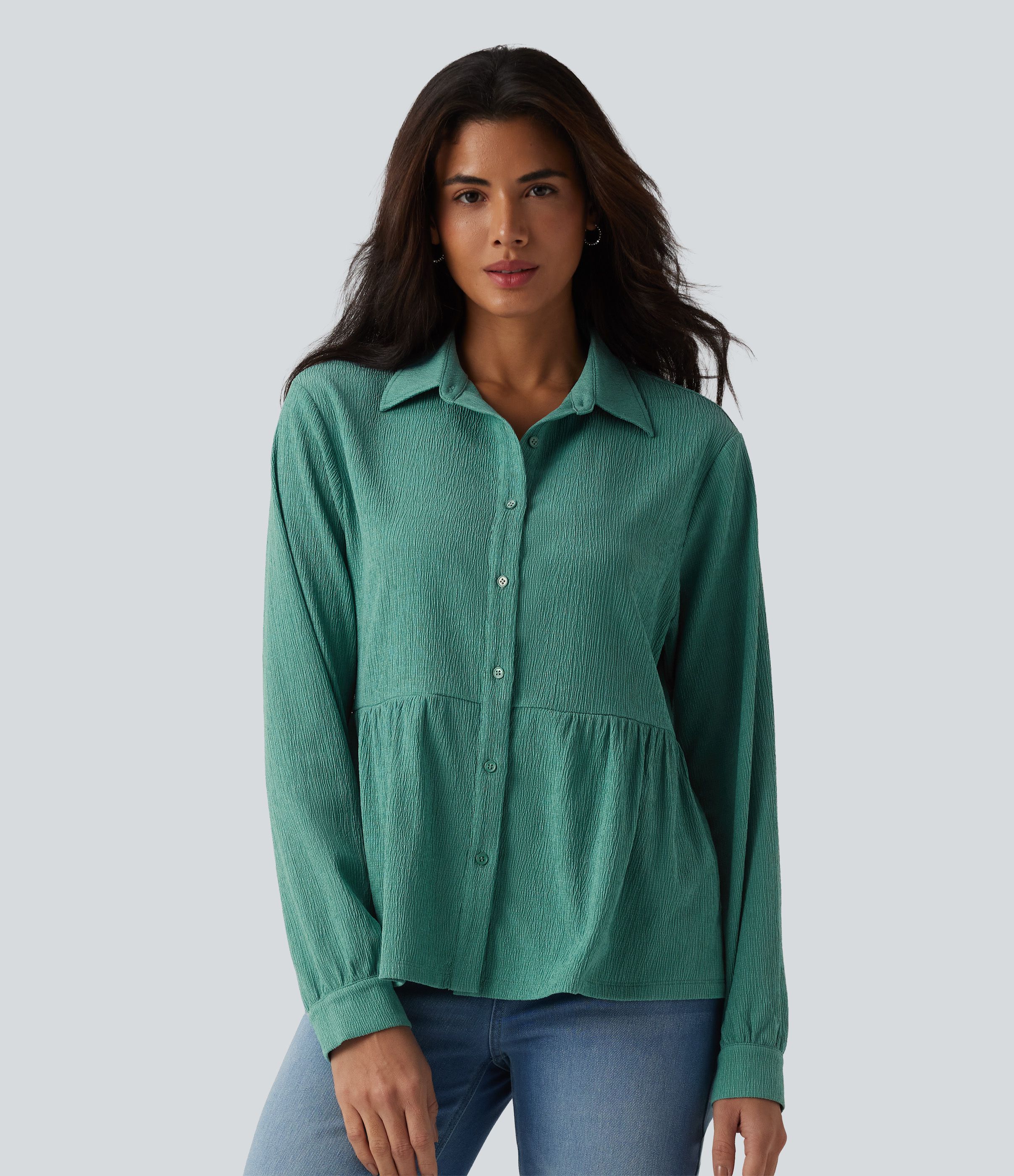 Collar Long Sleeve Ruffle Hem Crinkle Relaxed Casual Peplum Shirt with Pockets