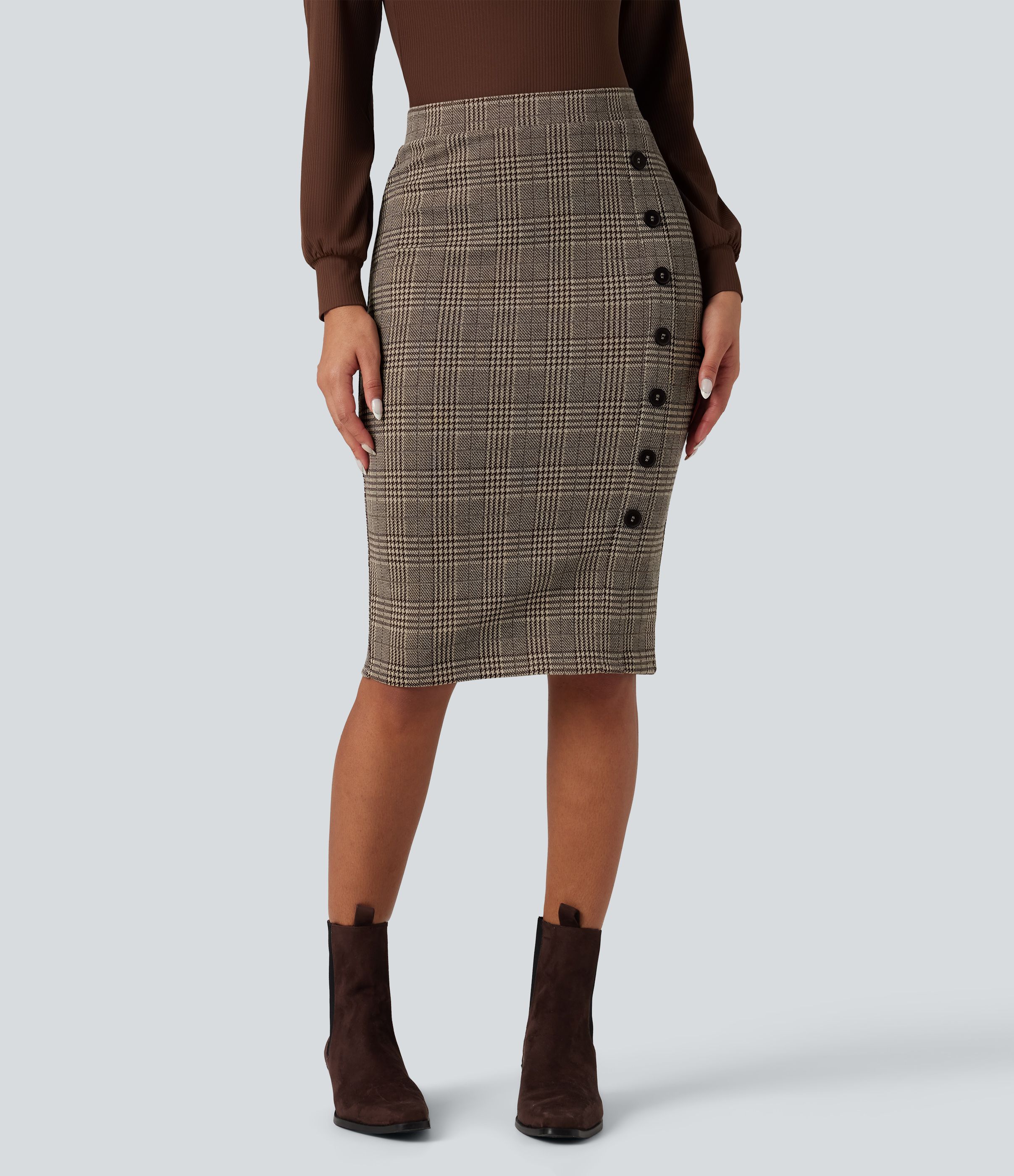 High Waisted Bodycon Houndstooth Plaid Knee Length Work Skirt