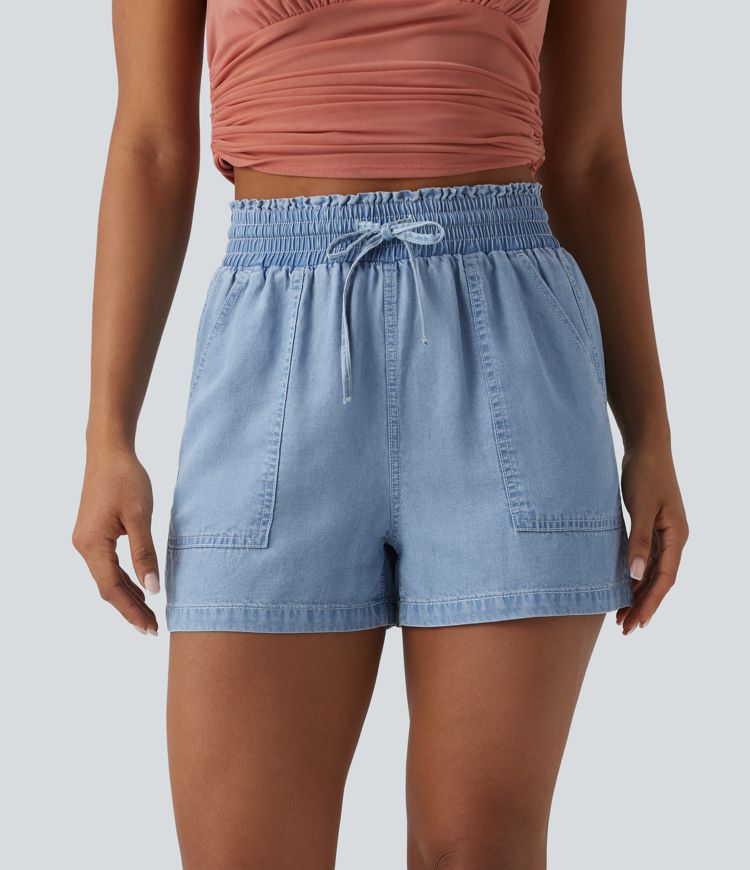 Shorts holgados vaqueros de tiro alto con cordón, adorno de volante, drapeado y bolsillos