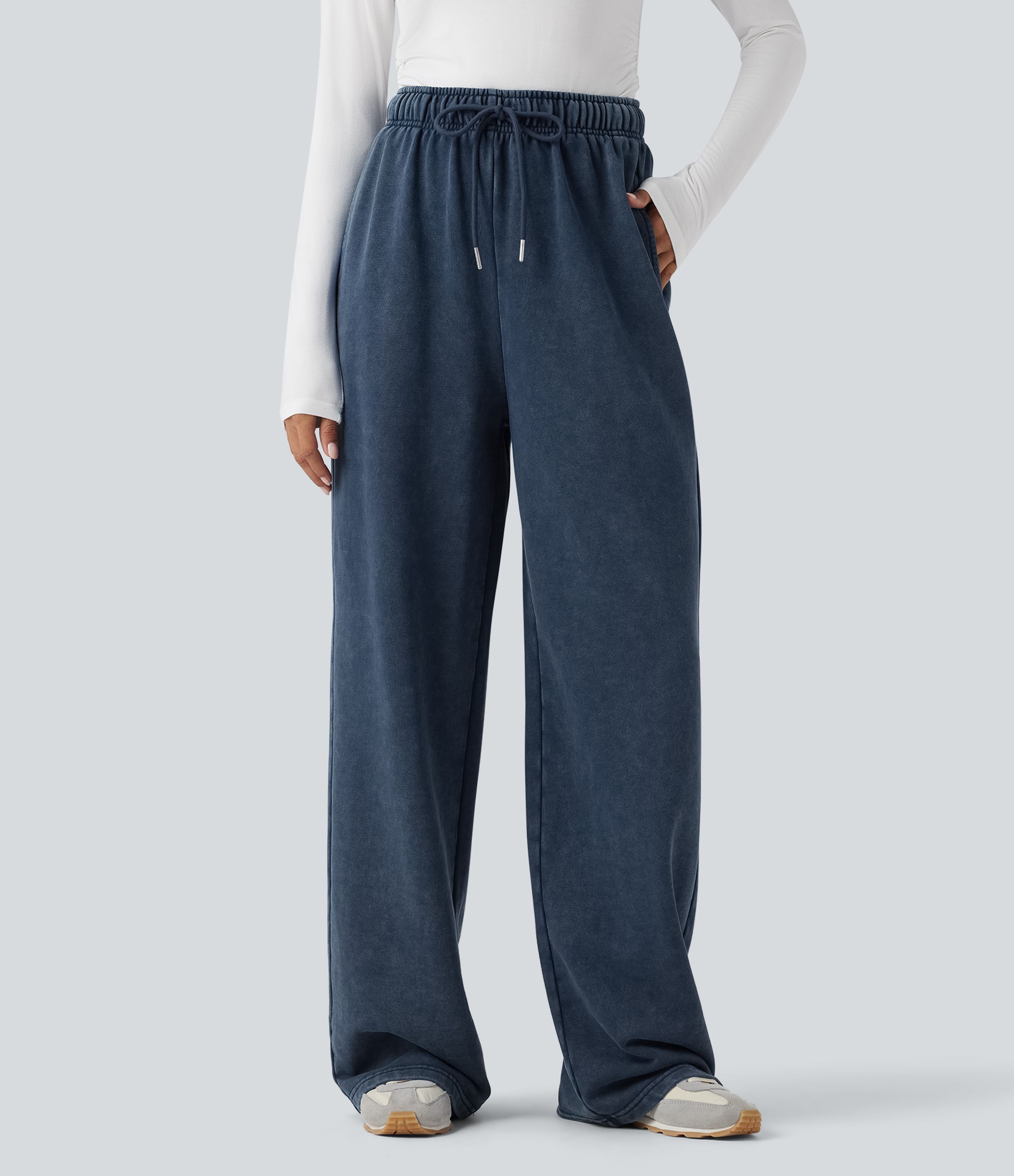 High Waisted Drawstring Washed French Terry Casual Cotton Pants with Pockets