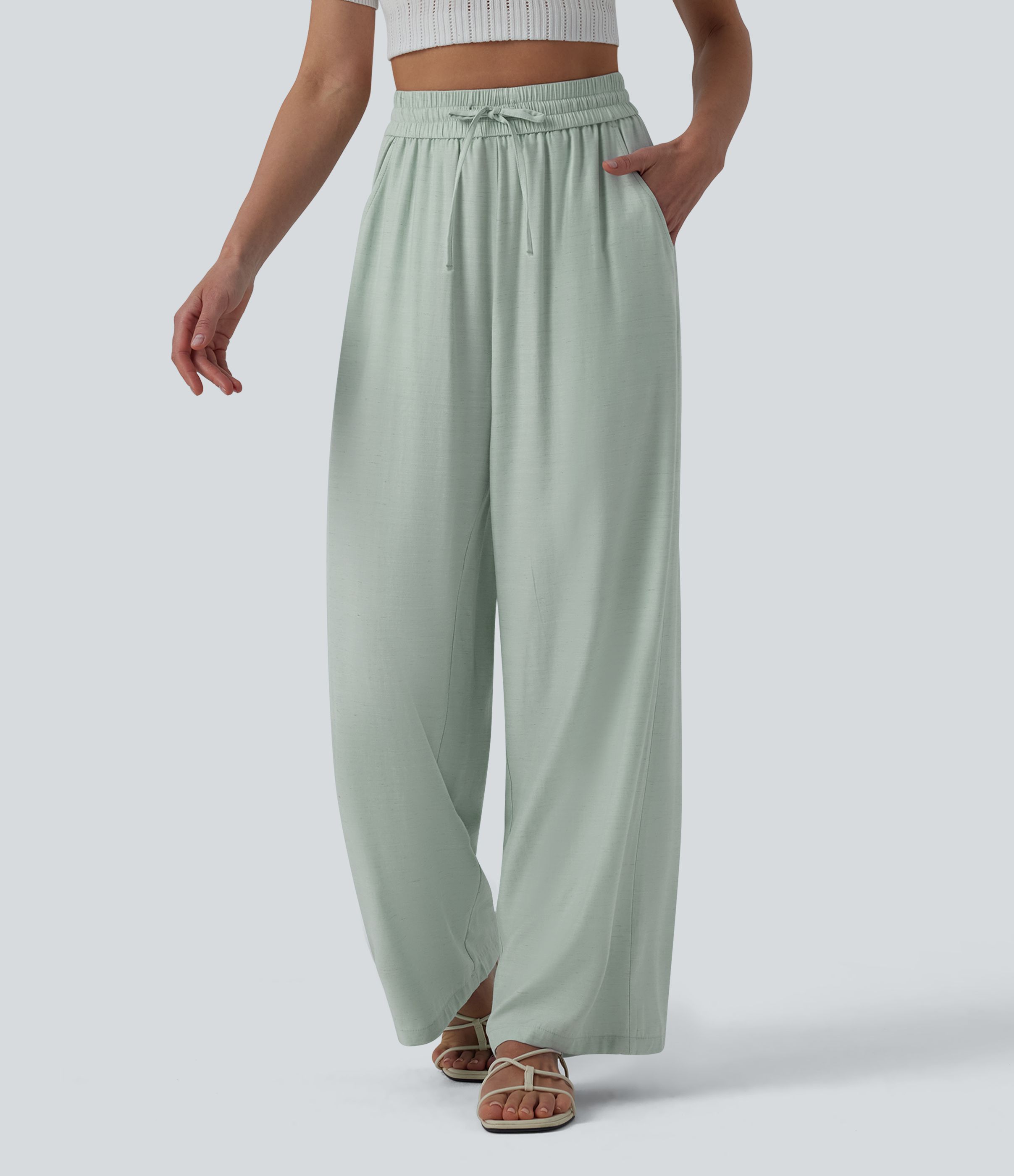 High Waisted Drawstring Wide Leg Casual Linen-Blend Pants with Pockets