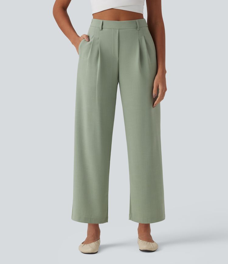 High Waisted Invisible Zipper Pleated Linen-Feel Casual Baggy Pants with Pockets