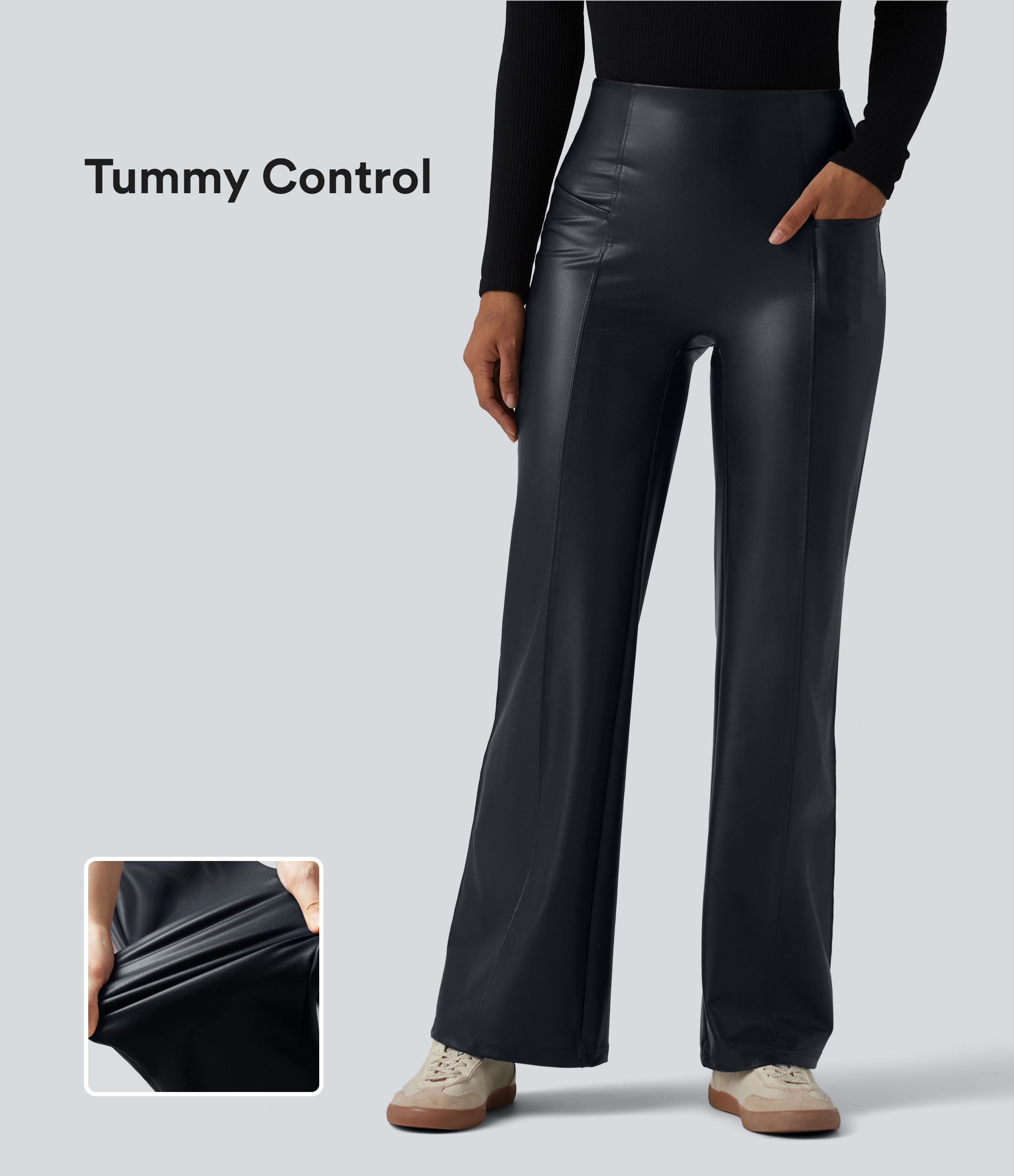 High Waisted Tummy Control Stretchy PU Casual Flare Pants with Pockets
