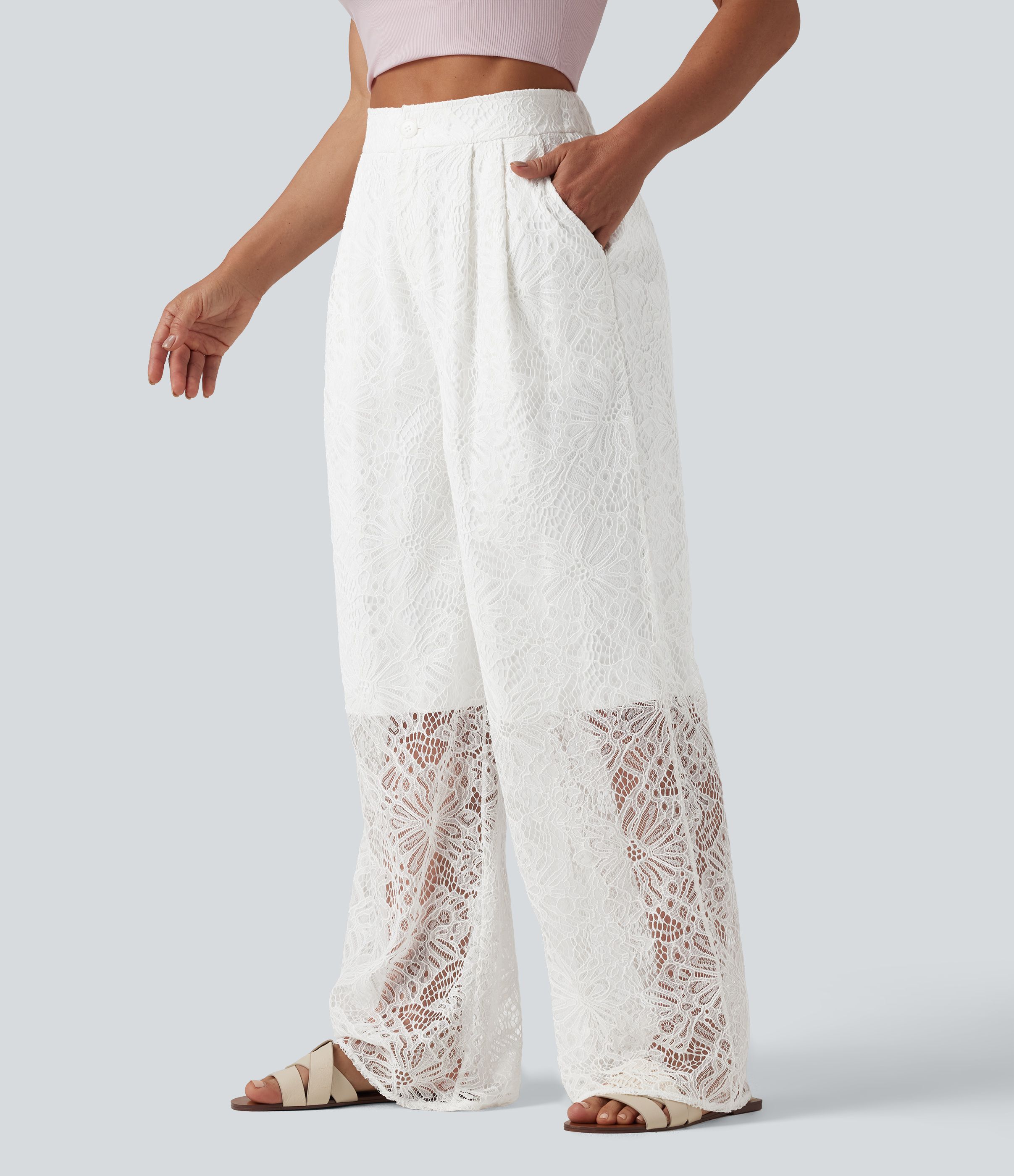High Waisted Wide Leg Contrast Lace Casual Pants with Pockets