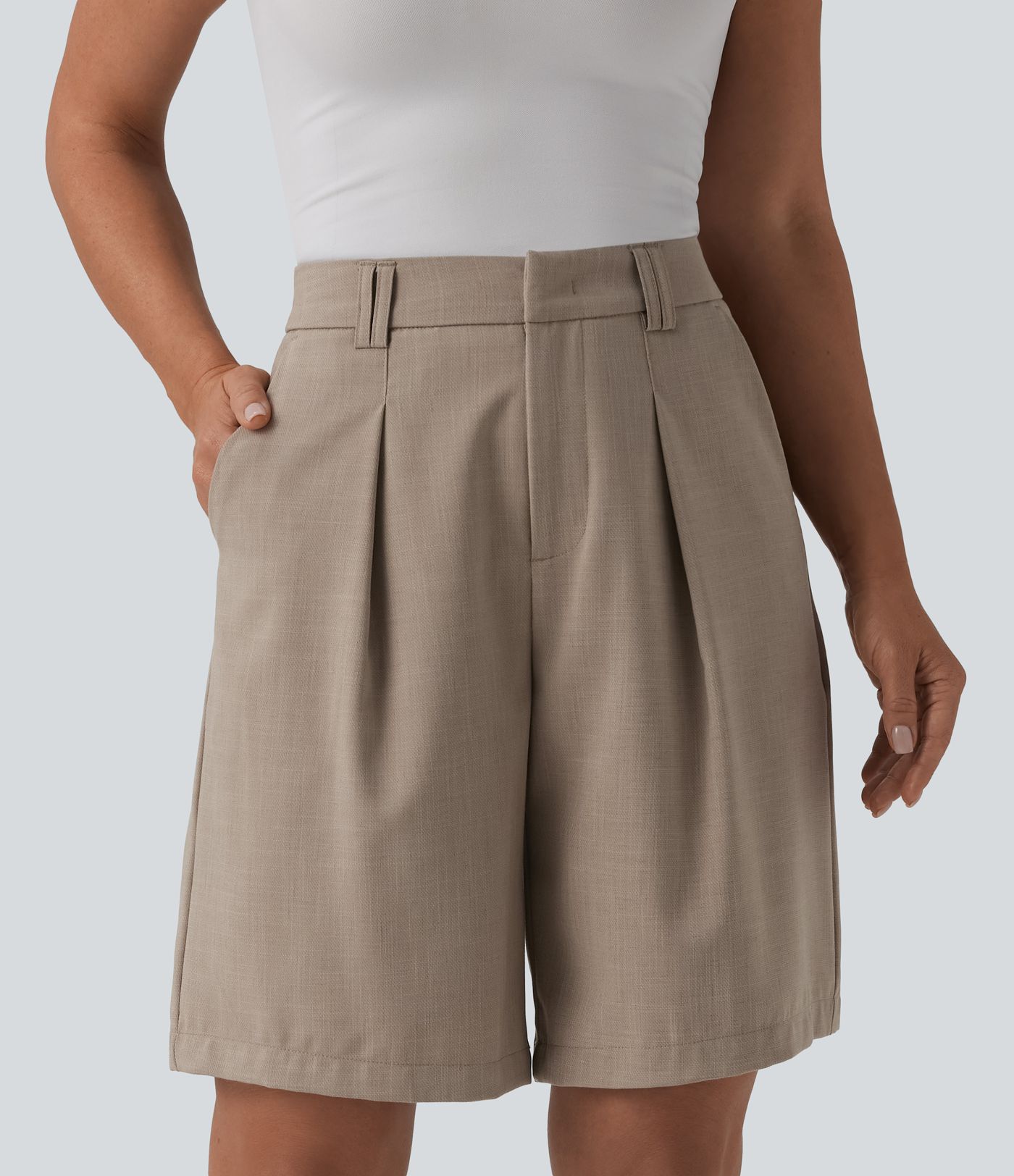 High Waisted Work Linen-Feel Bermuda Shorts with Pockets