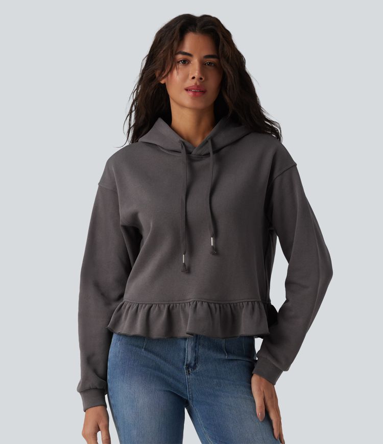 Hooded Drawstring Long Sleeve Ruffle Hem Casual Cotton Sweatshirt