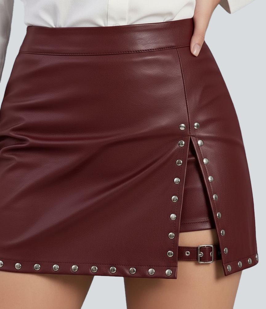 Mid Rise Studded Fleece PU Leather Micro Mini Skirt