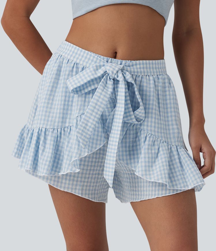 Mid Rise Tie-front Ruffle Gingham Resort Linen-Feel Shorts with Pockets