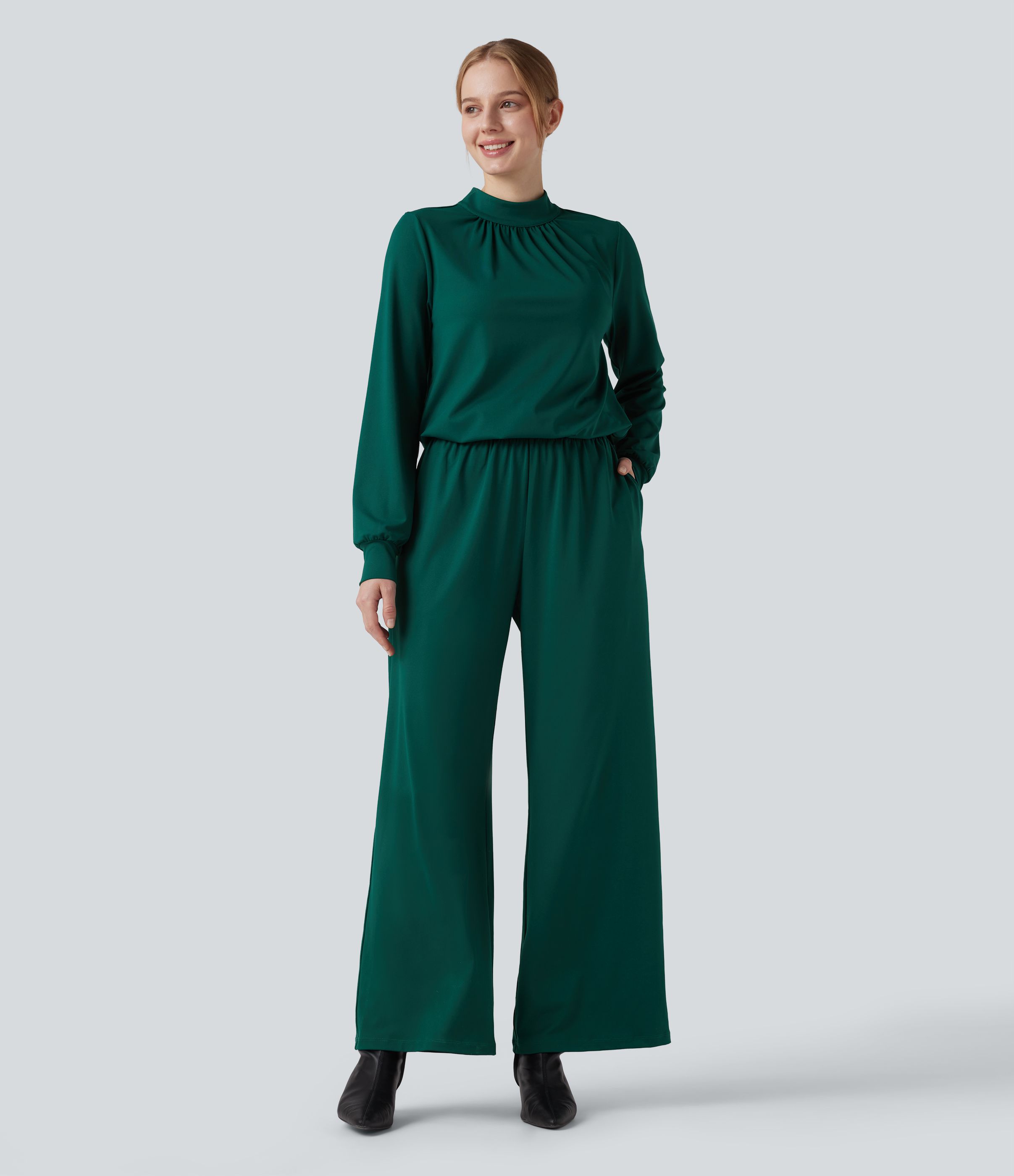 Mono de trabajo con cuello alto corto, abertura en la espalda, mangas largas, pernera ancha y bolsillos
