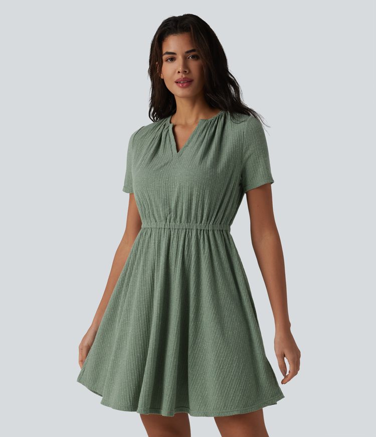 Ribbed Knit V Neck Short Sleeve Flare Mini Casual Linen-Blend Dress