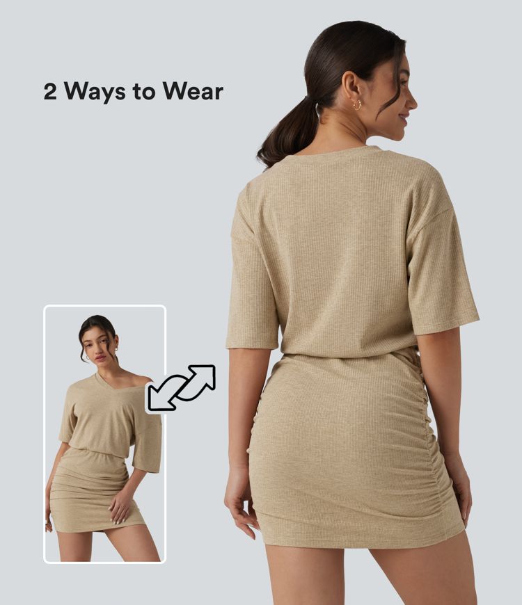 Ribbed Knit V Neck Short Sleeve Ruched Bodycon Mini Casual Dress