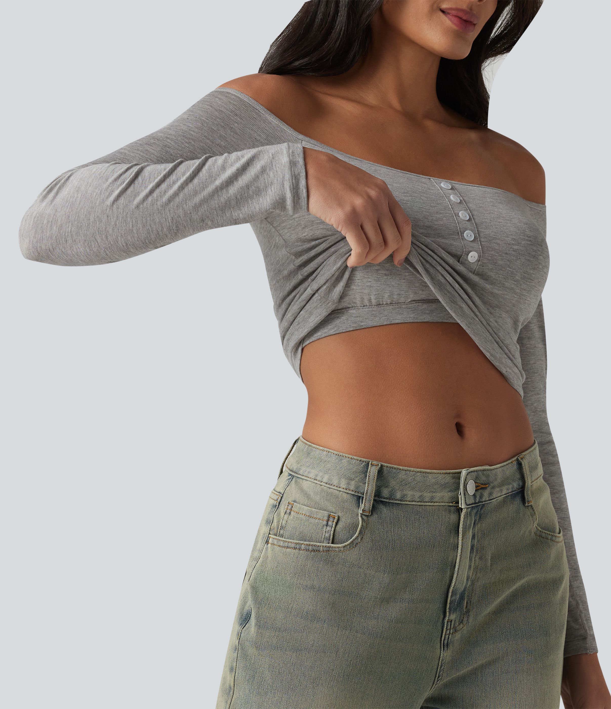 Ribbed Off-shoulder Long Sleeve Built-in Bra Ultra-slim Casual T-Shirt
