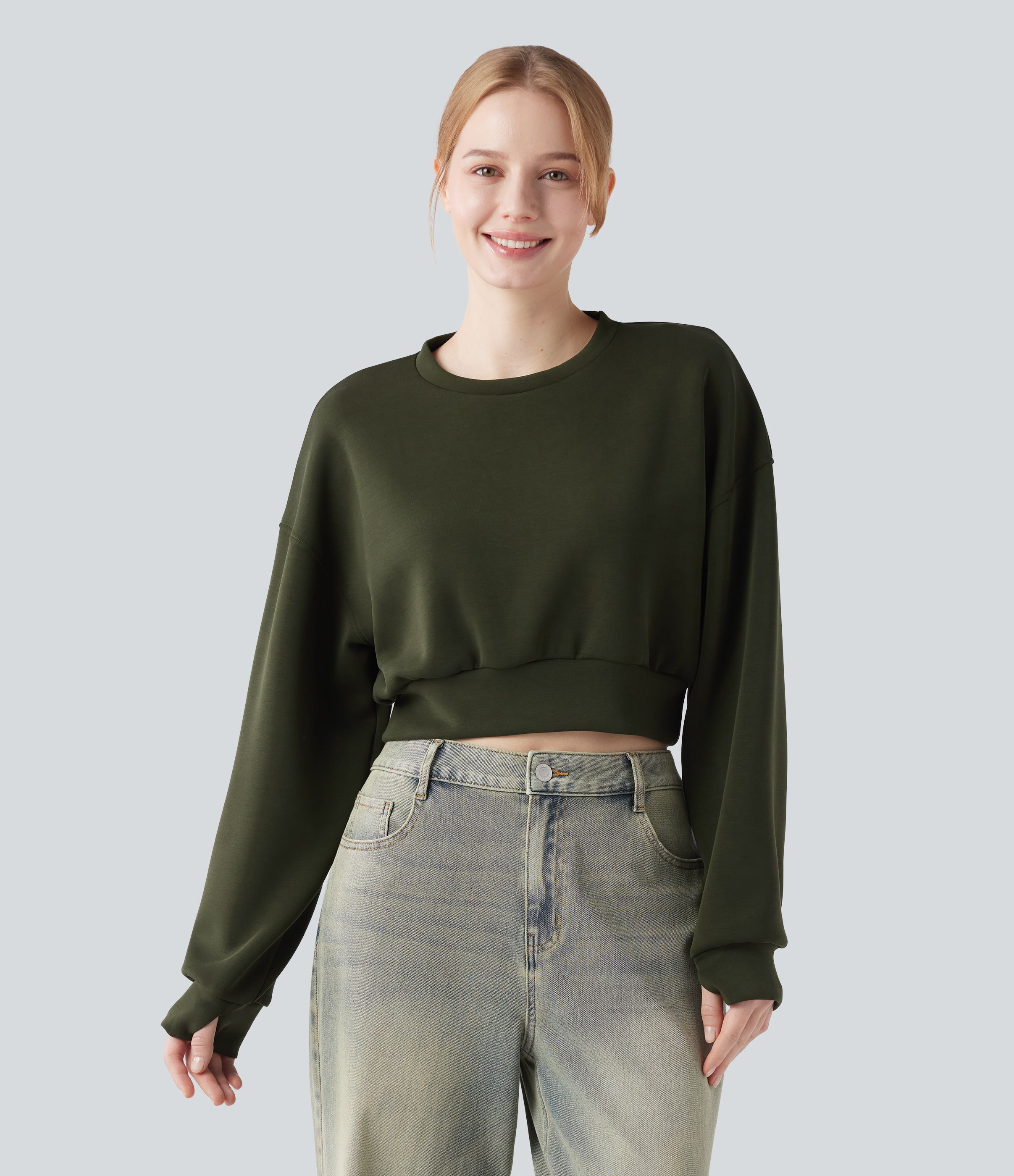 Round Neck Long Sleeve Thumb Hole Cropped Casual Sports Sweatshirt