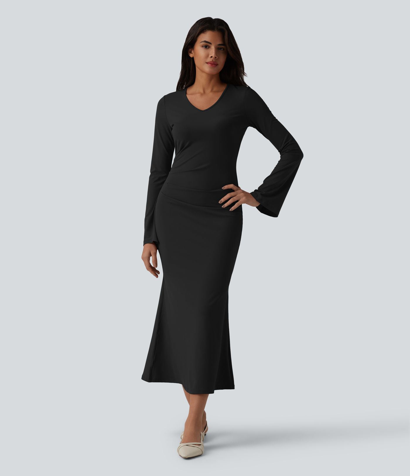 V Neck Flounce Long Sleeve Mermaid Midi Casual Dress