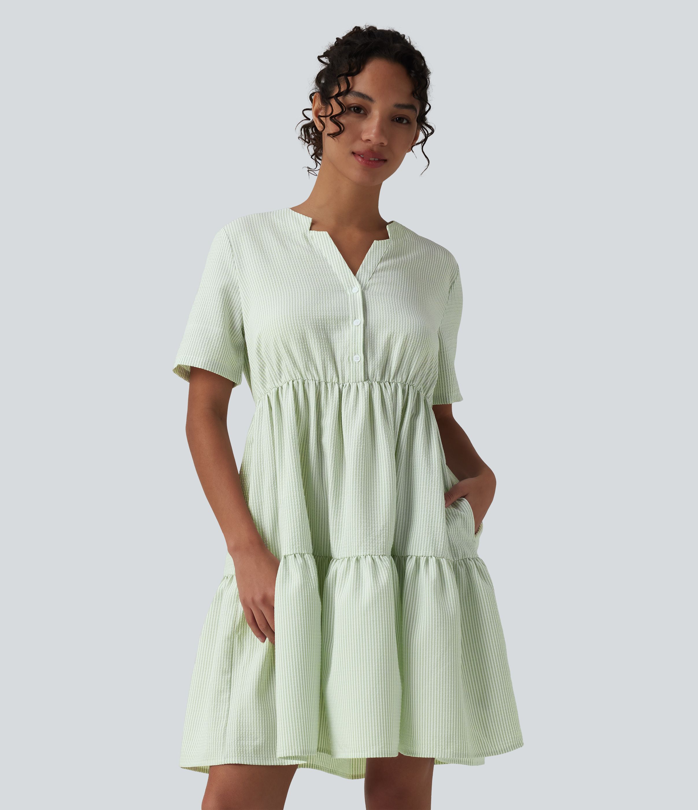 V Neck Short Sleeve Tiered Stripe Mini Casual Shirt Dress