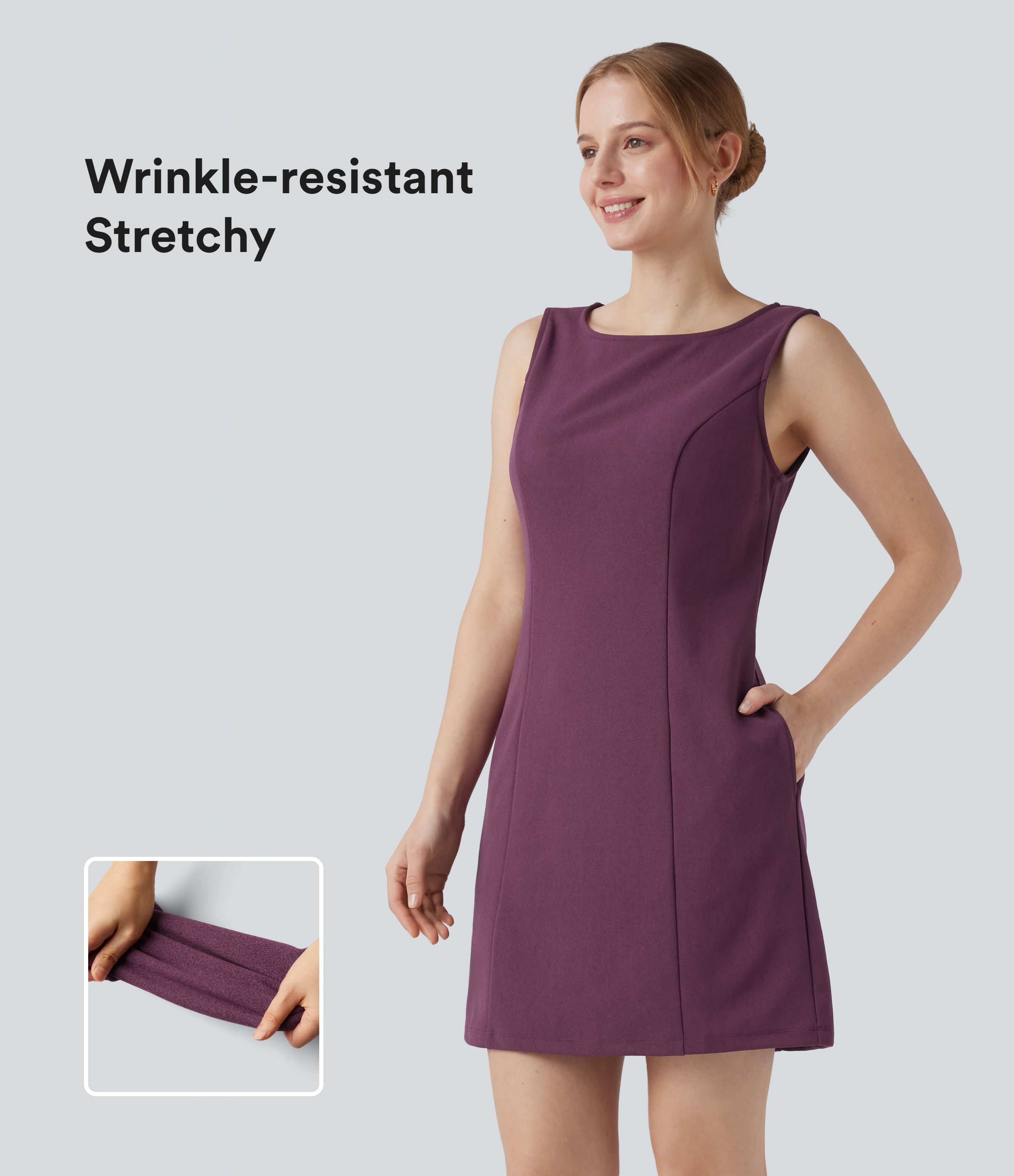 Wrinkle-resistant Boat Neck Sleeveless Mini Work Dress with Pockets